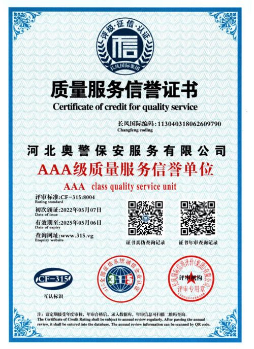 “忠誠的伙伴,非凡的朋友”,河北奧警保安服務有限公司本著“客戶的需求就是我們的追求”的服務理念,與廣大客戶攜手并進、共創(chuàng)恢弘偉業。